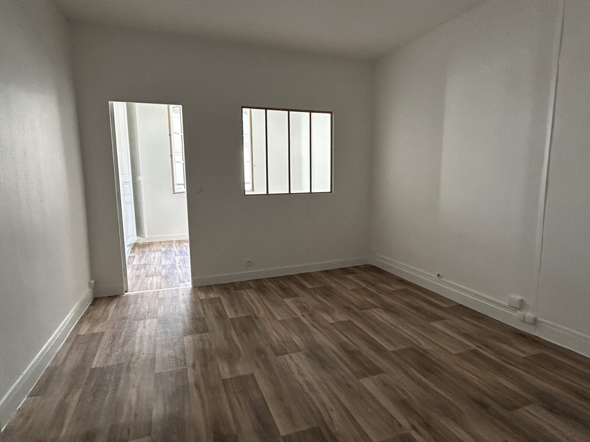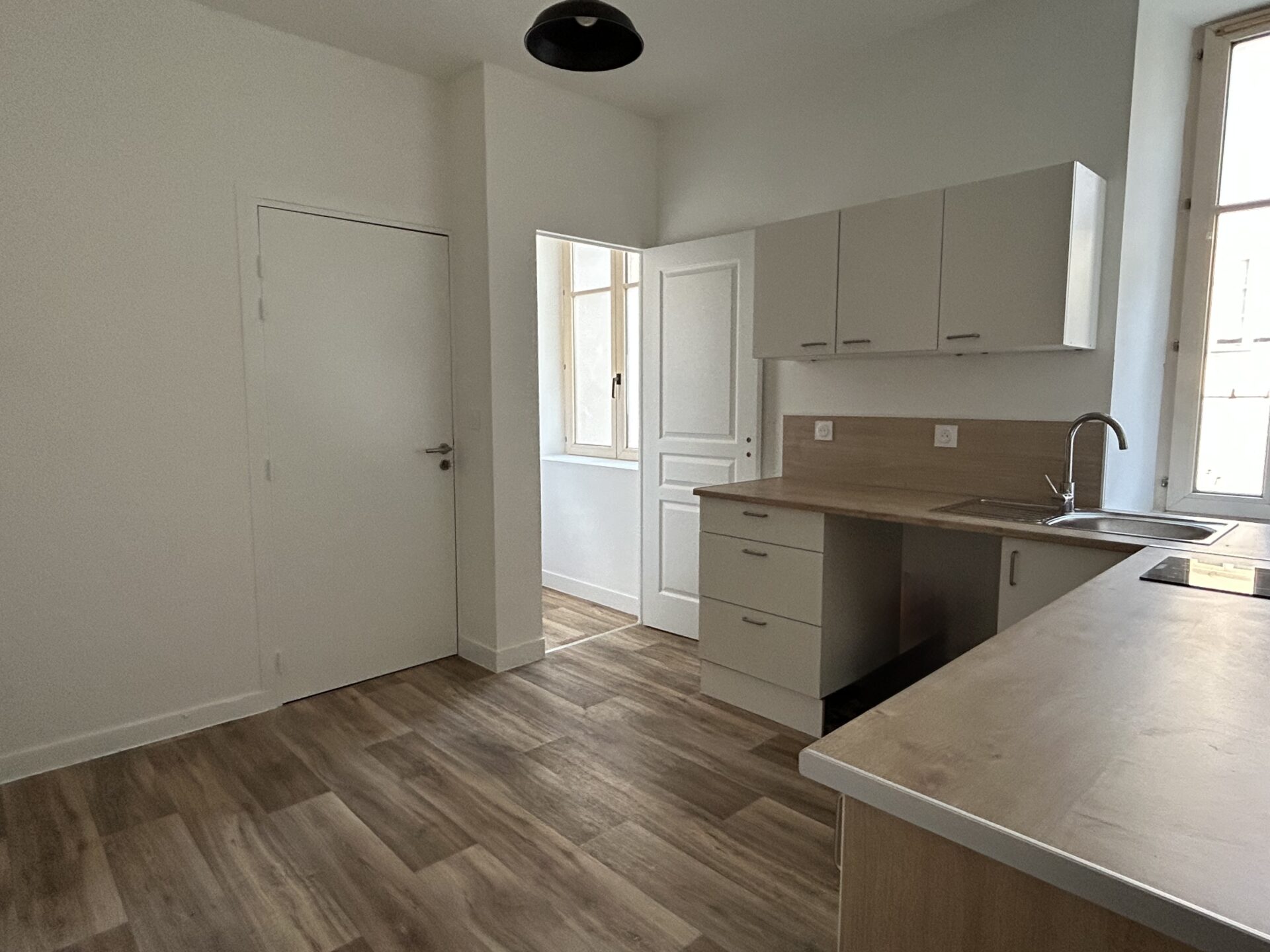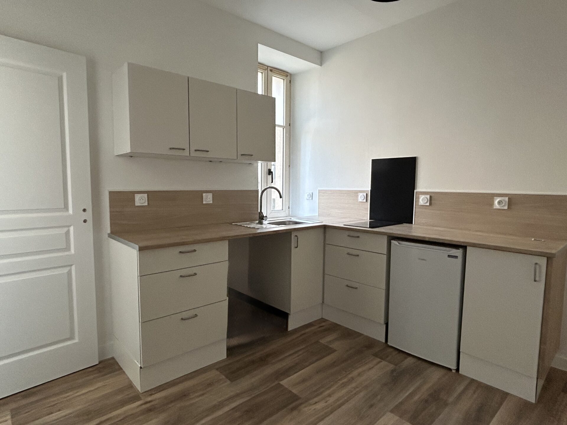 Au 2eme étage d’un immeuble ancien – T2bis de 41,74m², comprenant : pièce de vie avec cuisine ouverte aménagée équipée (évier, plaque, petit réfrigérateur, rangements hauts et bas), un salon, une chambre, une salle d’eau et WC séparé.